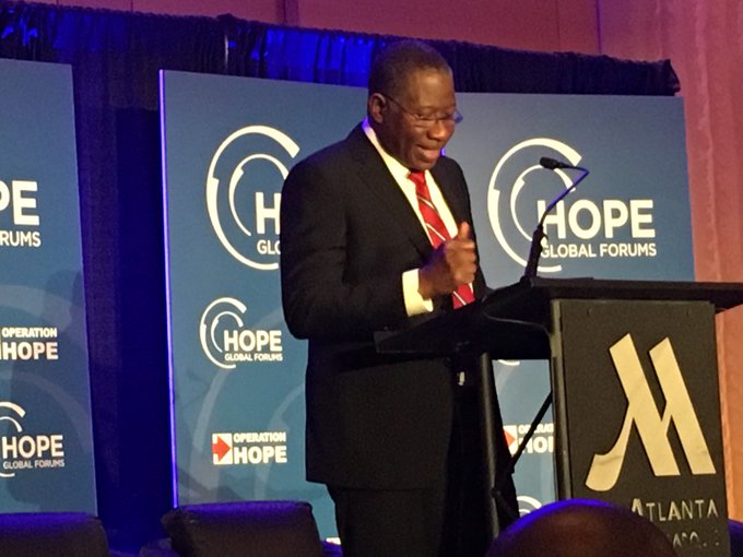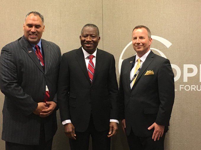 Ex-President Goodluck Ebele Jonathan was at the Hope Global Forums in atlanta today where he addressed the forum. The former president was later spotted in a photo shoot with other attendees like Ambassador Andrew Young, John Bryant Hope the CEO of Operation Hope, Kelvin boucher Director of hope global forum and Louis Negron atlanta president of Hope.
